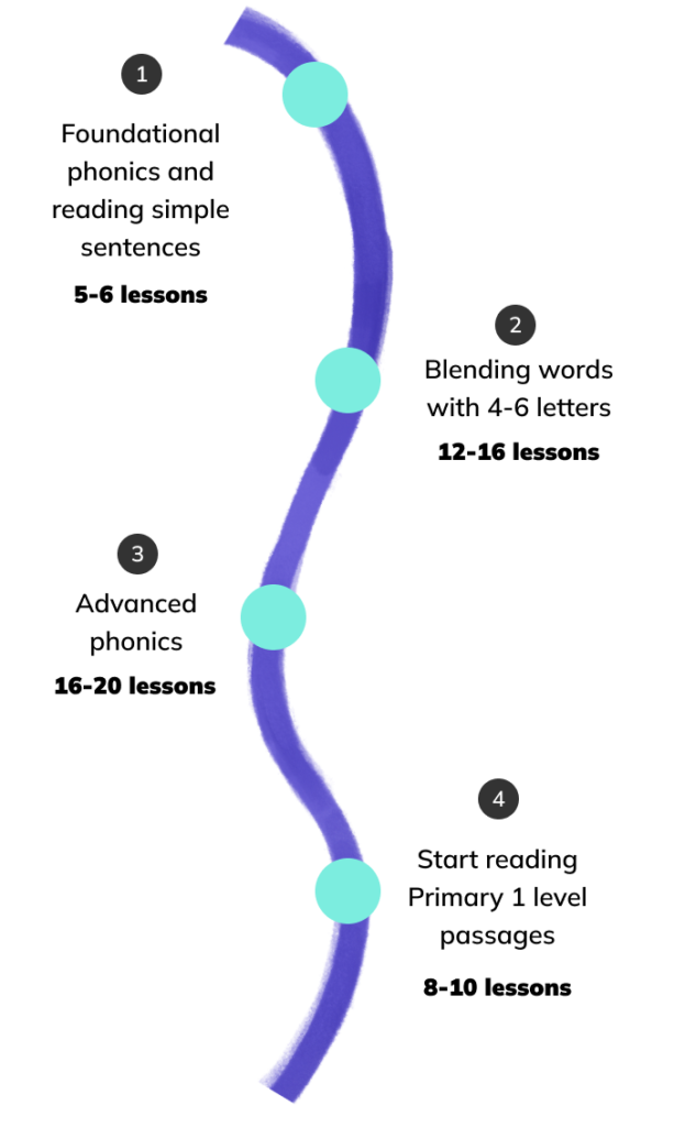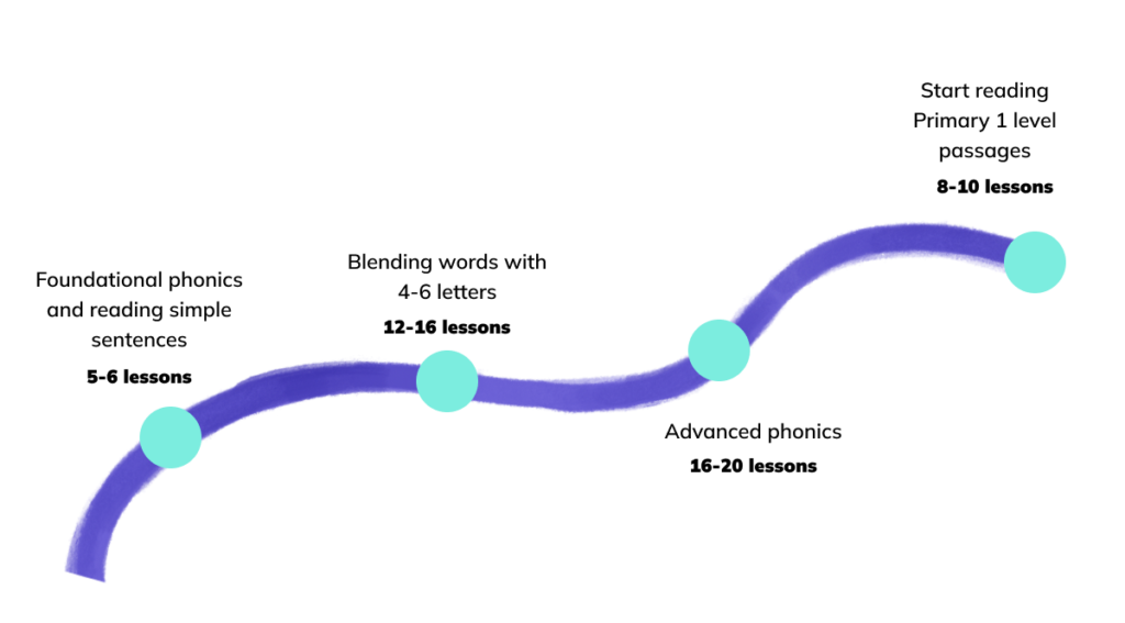 We understand that children at this age are naturally full of energy and can be playful. We embrace their playfulness and designed our classes such that they can channel that energy into learning how to read. If you are still uncertain about how your child might respond to the lessons, you can arrange a free assessment with us to observe how your child engages with us. We will provide you with our honest assessment as well. If we find that an online class is not a best fit for your child, rest assured that we will prioritise your child’s learning above all else. We genuinely want each child to benefit from our programme.